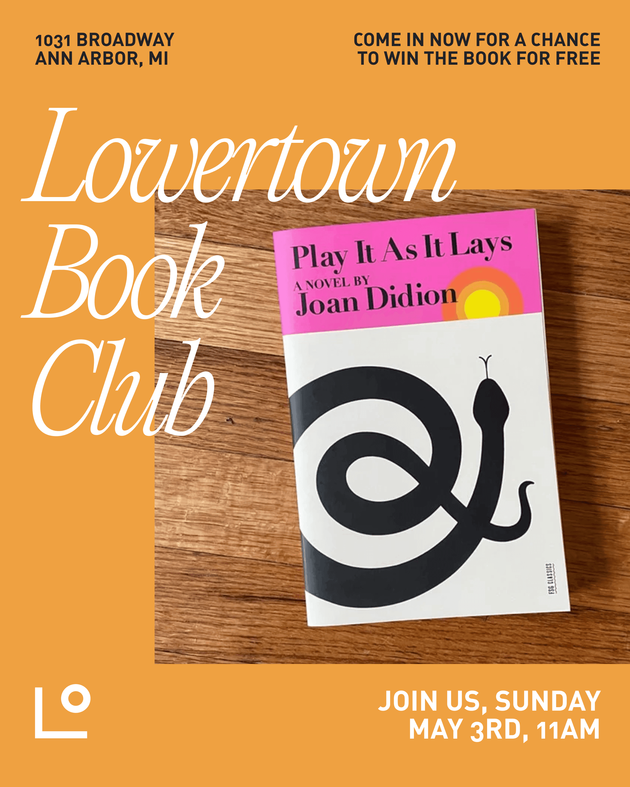 Our semi-monthly book club is back, and we're starting with Joan Didion's "Play It as It Lays" on Sunday, May 3rd at 11am.